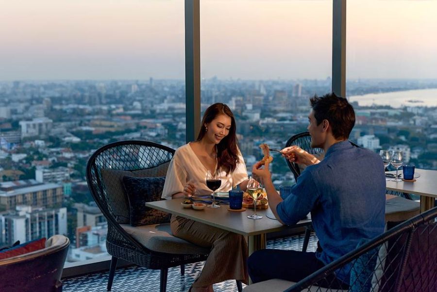 Set across the uppermost levels of INNSiDE by Meliá Bangkok Sukhumvit, LUZ Bangkok Tapas Bar spans the 33rd and 34th floors, where an indoor-outdoor layout opens onto uninterrupted skyline views. In a spectacle unlike any other in Bangkok, diners on the 33rd floor can look up into the base of the pool above.