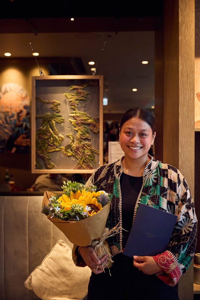 “Inspired by moss observed along a river during an afternoon walk, Katrina’s artwork is captivating, with flowing forms that feel calm yet slightly unpredictable,” Dr. Aron Harilela said. “Made entirely by hand using embroidery, knotting and tufting techniques, the work features a compelling soft, carpet-like surface with gentle curves and waves.”